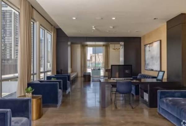 The apartment includes downtown views, quartz countertops, GE stainless steel appliances, private patio, front load washer and dryer, keyless entry, and smart home thermostat. Located in the heart of downtown Houston.