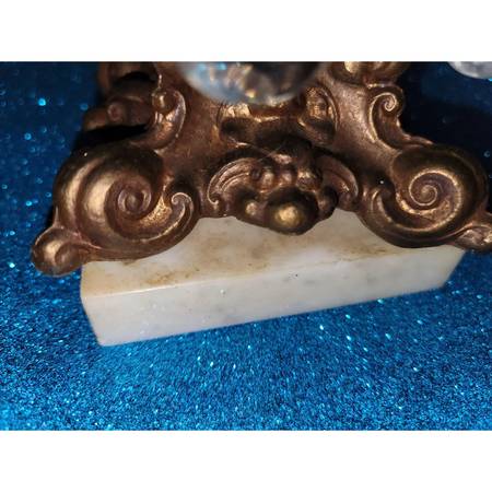 Lovely pair Hollywood Regency style candle holders / candlesticks. Having single candle holder with seven arms that have crystals hanging from them, very ornate body, supported by white and gray marble. Circa 1950's.