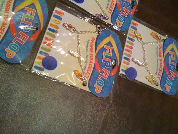 five brand new charm braclets with flip flops charms, brand new in package, selling each for 2.00