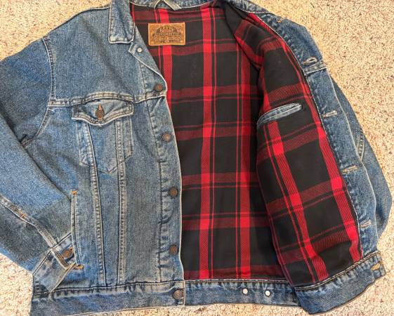 Authentic Levi's denim jacket with plaid lining. In very good, clean condition. Size medium. From a pet-free, smoke-free closet. Your $50 will go to a charity.