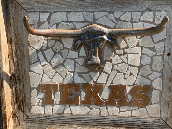 A cast iron long horn bull head mounted on the board wity Mosaic tiles patern background