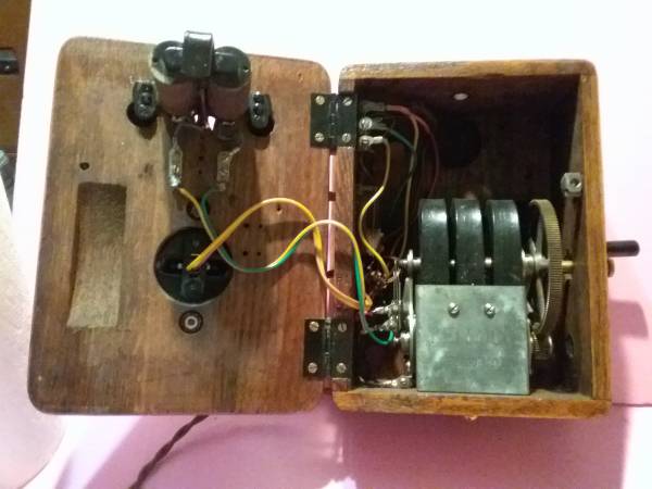 I restored this a couple of years ago while working on a few other projects. The restored finish is in very fine condition. Cleaned, rebuilt and rewired. Turning the generator crank rings the bells.