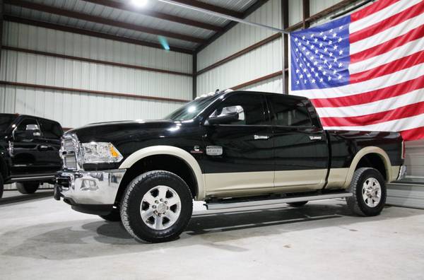 This 2013 RAM 2500 Laramie Longhorn 4x4 is a one-owner truck with only 153k miles, powered by the legendary 6.7L Cummins Turbo Diesel paired with an automatic transmission and electronic four-wheel drive, with 25 detailed service records reported to Carfax. Never lifted or leveled, it rides on all-terrain tires and features factory projector headlights, factory LED tail lights, B&W gooseneck hitch, and factory RamBoxes, making it both sharp and extremely functional. The truck is very clean inside and out and boasts the hard-to-find black and Cattle Tan saddle leather Longhorn interior with dual power seats, no foul odors or smoke smells, a fixed center console, factory touchscreen radio, backup camera, sunroof, dual-zone climate control, passive keyless entry, push-button start, power-adjustable pedals, built-in trailer brake, and power windows and locks, offering a perfect blend of luxury, capability, and reliability.