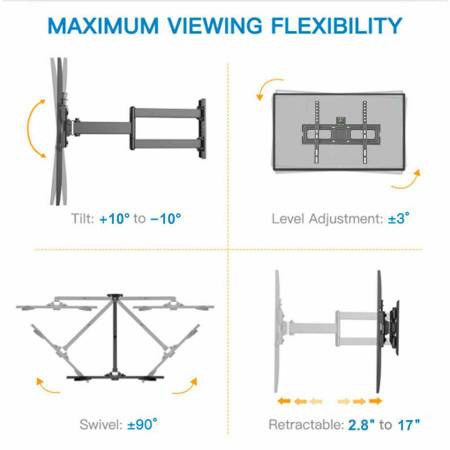 Tilts down 15° and up 5°, +/-180° Swivel (maximum swivel angle depends on TV size) for optimal viewing, provide smooth adjustment for all directions to suits your position, make it easy to view your TV from multi-angles. You can watch TV at living room, bedroom, kitchen,balcony...