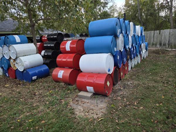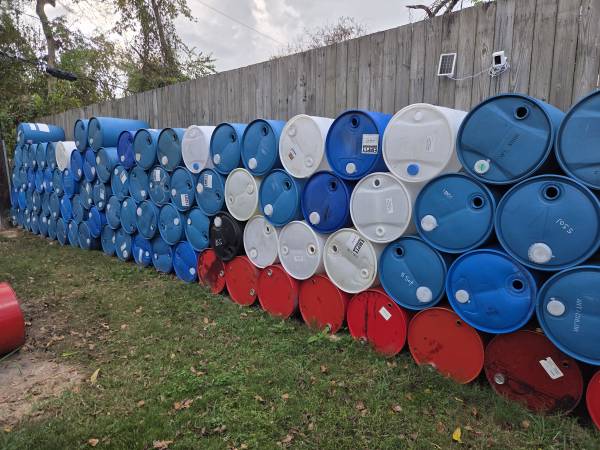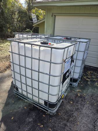 All barrels and totes have only been used once. Prices range from $15 to $100.