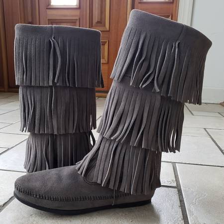 Minnetonka Gray Moccasin 3-Layer Fringe BOHO Style Boots Sz 9 -...