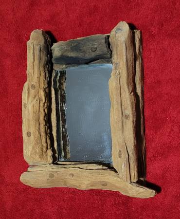 Up for sale is a Rustic Wood Framed Mirror. Frame is very rustic, rough hewn wood. Mirror is intact and not damaged in any way. Top part of frame is discolored from candle smoke as I used to have a candle sitting close in front of the mirror. Item also has a wire on the back for hanging. Mirror is 9" Wide x 10.5" High. Asking price is $20 or best offer. All sales are Final and to be made in CASH ONLY.