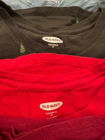 6 Old Navy Tees. Excellent condition. No rips, tears, stains or fading. Colors are red, maroon, dark green with Christmas trees, turquoise and two mauve. Size Medium. All 6 for $25