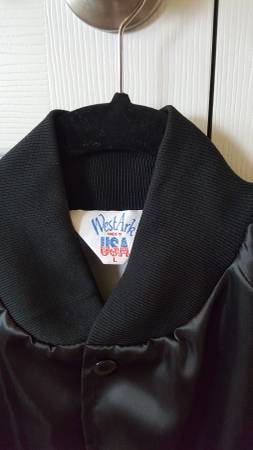 Selena y Los Dinos Satin Jacket. I bought this jacket many years ago directly from Selenas boutique when her store was still open. This jacket has red letters. Size L. Made in the USA. Jacket has six snap buttons and two front pockets. This jacket was not used at all. It still looks fantastic, and it is clean.