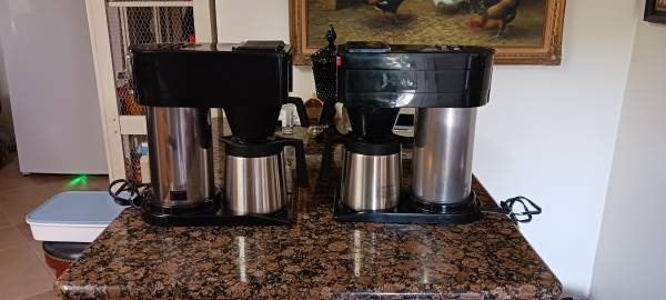 These 2 BUNN BTX- B Speed Brew 10 Cup Stainless Steel Thermal Carafe coffee pots have been in storage for the last 11 years. Because it uses an internal commercial grade stainless steel hot water tank that keeps 70oz of water always hot so you can quickly brew at the flip of a lid. It’s commercial style multi-stream sprayhead evenly showers hot water over the coffee grounds to maximize the flavor of your coffee. While coffee is being brewed, the newest water in the tank is heated to the proper temperature and held until needed. Great for Home/office/food truck/Church. Brews 10 cups in about 4 minutes and 20oz of coffee in about 2 minutes. It has a Commercial grade stainless steel hot water tank. Thermal carafe stays hot up to 2+ hours. Color black. Dimensions: 15.1″ H× 7.1″ W× 13.9″ D