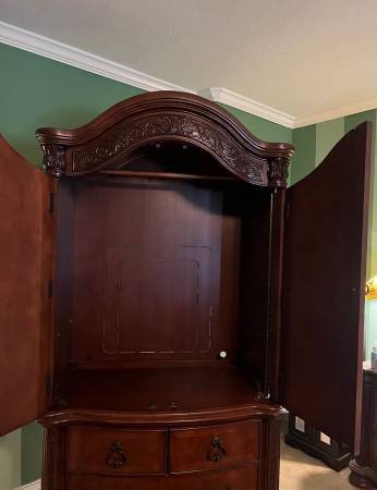 1. Armoire w/ details in leather, very strong, durable. Very Large leather front, drawers, rod inside and adjustable shelves for a TV that can be removed.