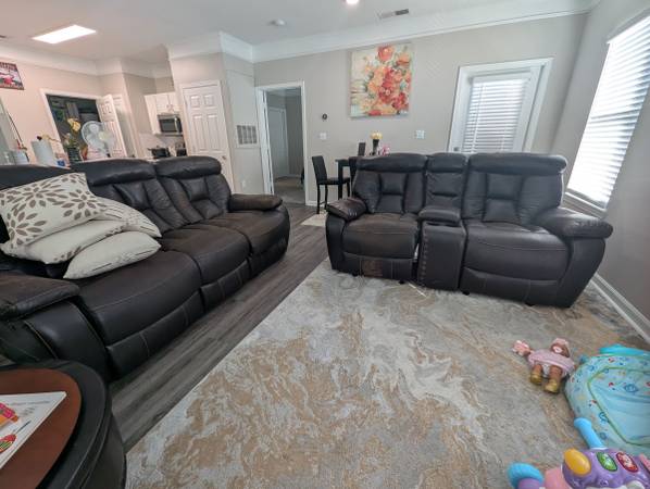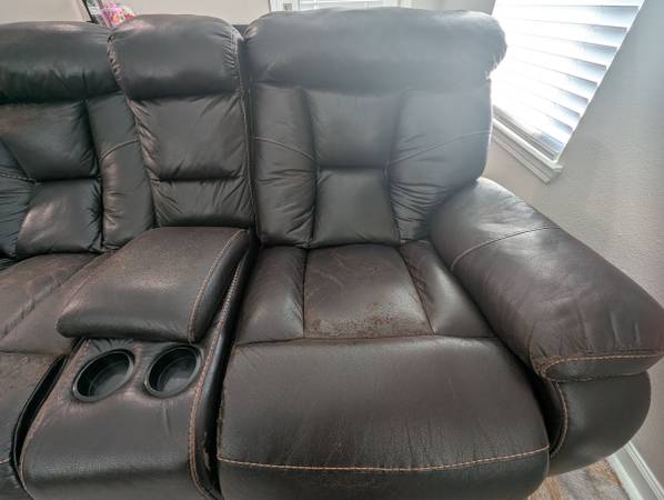 Brown leather reclining sofa and loveseat set, with a center console and cup holders on the loveseat. Some portion of the leather has peeled off, and some portion shows visible sign fade that comes...