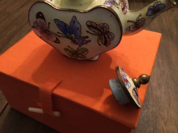 Copyright Empress Arts Ltd. Vintage Empress Arts Miniature Enamel Teapot With Butterfly Design. This small round teapot features a beautiful multicolor enamel finish with a delightful butterfly pattern. The set includes a miniature lid. 2.5 inches in height. This vintage piece is a one-of-a-kind original from the Empress collection, designed with care and attention to detail. Would make a fabulous Holiday or Christmas gift.
