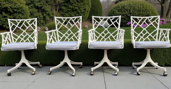 “THIS ITEM IS AVAILABLE UNLESS IS MARKED SOLD” Vintage Phyllis Morris for Kessler Dining Table and 4 Swivel Chairs With Rolling casters. Set Is Made Of cast aluminum in a faux Bamboo Style, Glass...