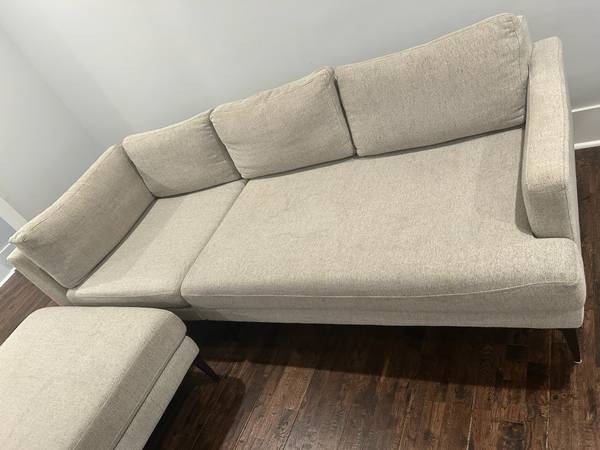 Selling West Elm Andes 3-piece sectional/sofa/couch 94” wide, 39” depth, 31” height. Ottoman is 39” width and 39” depth. It’s been loved by our family of 5 but we are out growing it. Minor stains can easily be cleaned with upholstery cleaner. Buyer picks up.