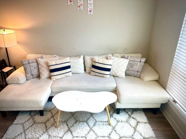 A sectional couch in cream white(beige) very comfortable. Fairly used(3months) and still in very good state. I’m offering it alongside a beautiful center table and six throw pillows