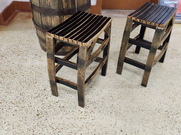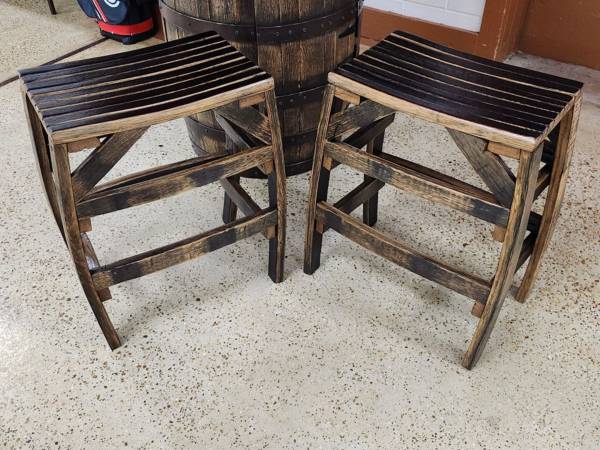 Authentic Bourbon Whiskey Barrel Handcrafted Bar Stools. These are made completely from retired oak barrel staves. These can not be mass produced as each stave is curved and shaped differently. Standard stool height for barrel tables is 24" but this can be customized. The seats are approximately 18" x12" and surprisingly comfortable. The staves are perfectly "rounded for your butt". Theyre $175 each. Contact me to place your order or to make pick up arrangements. I'm located in La Porte TX. These can also be picked up at any of our events as long as you place your order in advance.