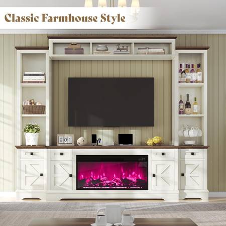 NEW IN BOXES. Sells on Amazon for $729.99 (save $140.00) under the same name. Off-white, with 3 AC power outlets, fits TV up to 75”. Fireplace has a timer you are able to change fireplace colors and fireplace does not heat. Comes with remote. You were able to read full description on amazon.com. 15.7”D x 98”W x 77.8”H. Tomball 249/Northpointe Blvd. area