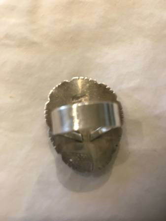 Amazing blue/grey/white variegated rare turquoise ring set in sterling silver. Stamped Sterling on back of ring. Features rope design bevel with larger sculpted bevel. Fits size 6 1/2 ring finger. Excellent condition! Originally purchased from Impressions of Santa Fe at the Houston Live Stock Show and Rodeo market.
