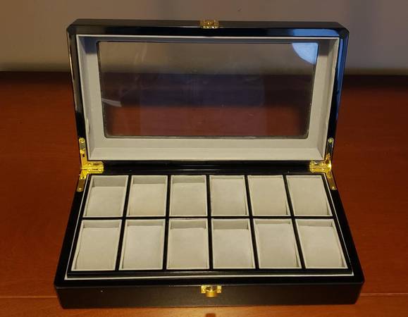 Two watch display storage cases. One black leather 10 watch compartments and one black lacquer 10 watch compartments. They list online for $150.00 to 250.00 each. Will sell separately.