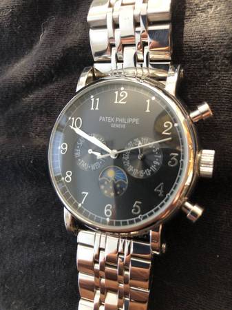 This is a Patek Philippe Grand Complications replica watch. Replica meaning it is the Asian version replica. Automatic movement self winding. Does not need a battery. Like New. Worn only about 5 times. Comes with real crockodile wrist band. That is you can have the option of putting the black crock band and wearing it like that, or wear it with the metal band. The metal band is attached to it now, and it comes with the extra band that is real black crockodile I had custom made for it. One of several watches I fell in love with through the past few years on trips abroad. Now I decided to sell them. It's a real nice looking watch. You can see the internal movement moving from the back glass see through. Comes with a black protective zipper pouch.