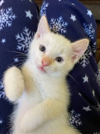 These blue eyed cuties are litter trained and weaned. They have been socialized with children and other cats. They just turned 10 weeks old (Born in mid Oct). They will go to their new home with a three month supply of flea/heartworm prevention. Have both male and female. Adoption fee applies.