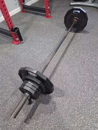 - 245 Lb Olympic Weight Set (45 Lb Ethos Barbell + 200 Lbs Iron Grip Weight Plates - 2×45, 2×25, 6×10).