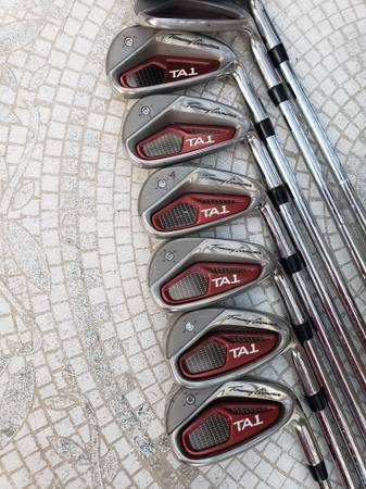 TA1 irons, 4-9, plus Gap and Pitching wedges. Good shape but a good cleaning wouldn't hurt. (I'm terrible about that) Faces are all in good shape, grooves in good shape also. Upgrading clubs so...