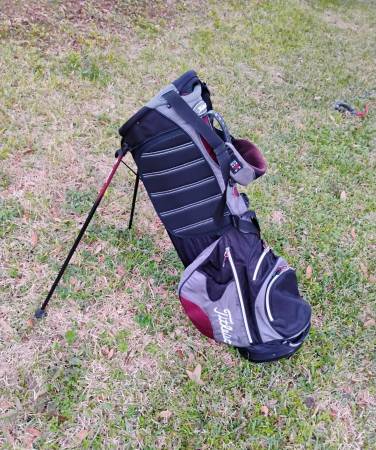 Titleist Golf Club 🏌️♂️ Stand Bag. ⛳ Good condition. 6 slots. Rain cover. All zippers work. Lightweight and has carry strap. Pickup by Clay Rd and Fry Rd, Katy, Tx 77449... No Zelle Driver putter...