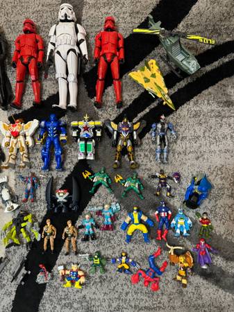 64 pieces of mixed action figures / accessories Selling as a lot. What you see in the picture is what you will be receiving. Talking white stormtrooper, Bandai 96’ Megazord power ranger, etc Price -...