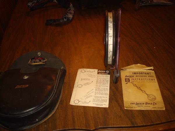 Vintage Lufkin Model 202 Rolling Tape Measure Wheel 100 ft. with Leather Case and original instructions. Lufkin Rule Co 202 Saginaw Mich 1956 Pat. Tape Case handle extends like an accordion to the height you prefer. The Maroon colored wheel is 7 ¾ inches in diameter. You simply adjust the chrome center knob until the counter is a zero and the wheel pointer is at zero and walk the distance to measure. It has 2 patent numbers on the tape, 2557481 and 2733511 . The first was in 1951 and the second in 1956. A nice tool