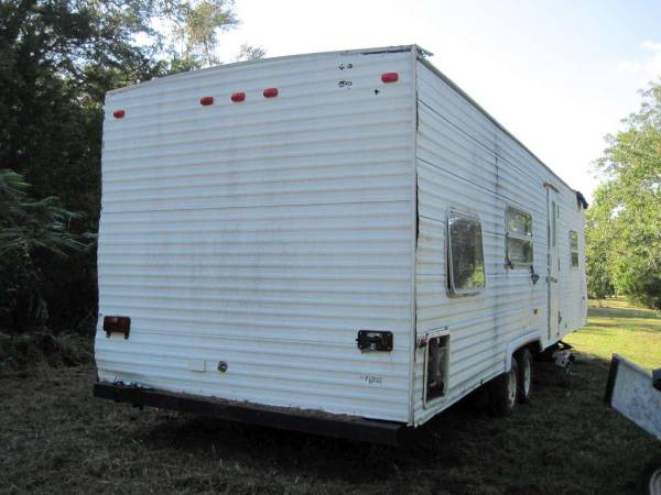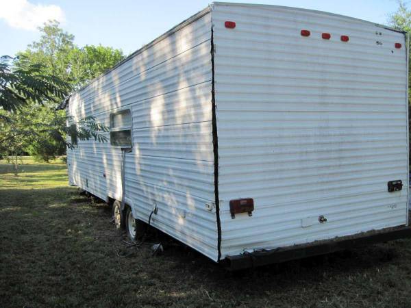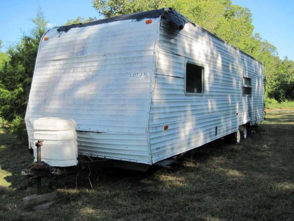 No title. Not sure if it is road worthy. Tires should still be ok. Front room is pretty gutted. Water heater not working. Several roof leaks, some pictured. Pretty sure original a/c's not working. Haven't tested the microwave.